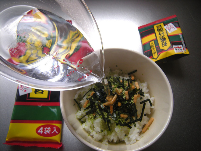 Nhưng hiện nay, món cơm này không đạm bạc như truyền thống mà thay vào đó là bổ sung thêm cá hồi, trứng cá, rong biển rất hấp dẫn. Bạn chỉ cần cho lên cơm rồi đổ nước sôi vào là có thể ăn ngay rất tiện lợi.